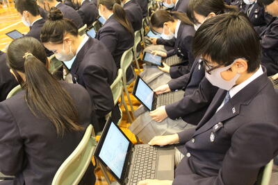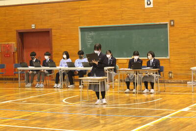 5月2日(火)4年振りに全校生徒が会同しての生徒総会を行いました。生徒総会議案のデータを生徒それぞれが端末に取り込んで総会に臨み、たいへん活発な質疑応答が行われました。