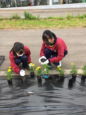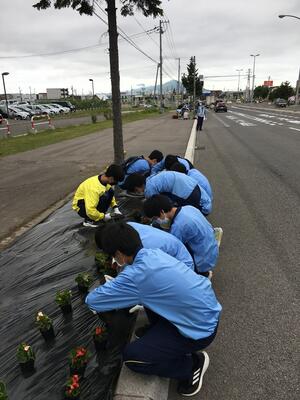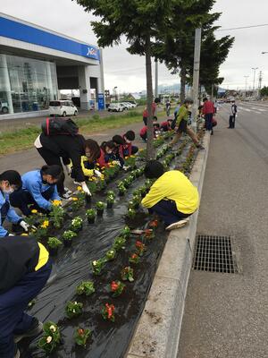 6月11日(土)、函館新道の入口・出口に当たる道路を花いっぱいにして飾り、函館に来る人々を出迎え、送り出そうという趣旨で、「花かいどうボランティア」が行われました。約600人が参加し、桔梗中からは1年生~3年生までの34名が参加しました。