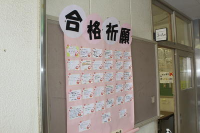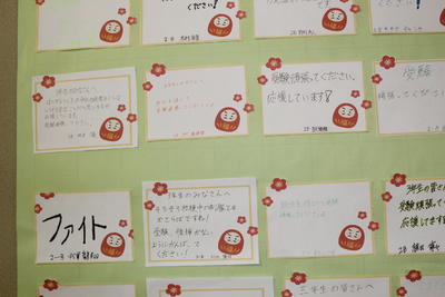3月3日(木)に控えた「北海道立高等学校の学力検査」に向けて、2年生から3年生への合格祈願メッセージが3年生の各教室前掲示板に登場し、先輩たちの奮闘を、合格を祈念しています。
