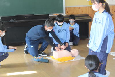 1年生の保健体育科の授業で心肺蘇生に関する学習を行いました。心肺蘇生法の講習等で用いられる実際のモデルを使っての実習も行いました。