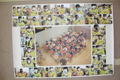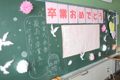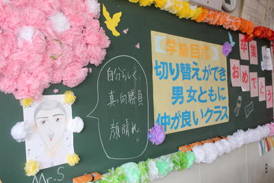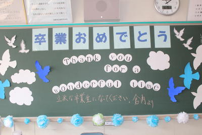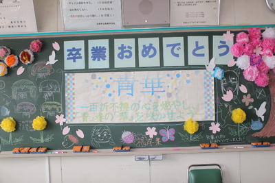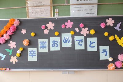 新型コロナ感染拡大防止のため、卒業式後に行う学級活動に保護者は参観できませんでしたが、式場の体育館で、事前にビデオ撮影した卒業記念合唱を鑑賞しました。学級活動を行った教室の黒板や掲示物の写真を紹介します。