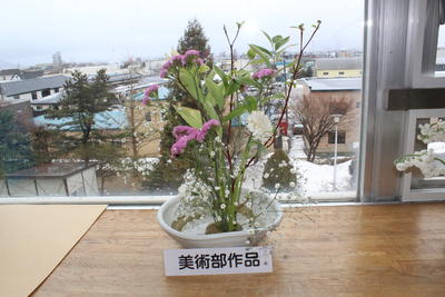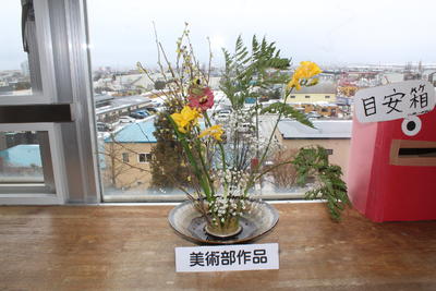 生徒玄関、職員玄関近くの廊下、2・3・4階の出窓に、生け花が飾られています。これらは美術部に所属している生徒たちの作品で、華やかさと落ち着いた雰囲気を各階につくっています。